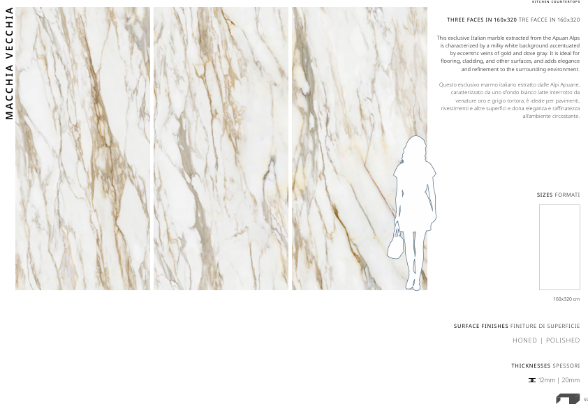 Mô phỏng Calacatta kinh điển, nhưng nhấn nhá vein vàng ấm xen lẫn vân xám, mang hơi thở “classic luxury” mà vẫn hiện đại. Phù hợp không gian chú trọng chi tiết trang trí, nẹp kim loại vàng champagne, đèn thả pha lê.